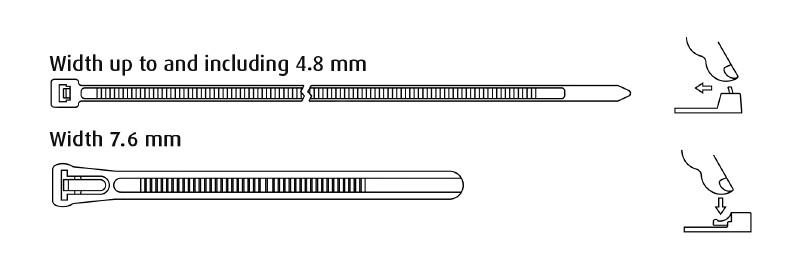 Vuoi rilasciare la fascetta per cavi? Bisogna utilizzare il meccanismo di chiusura sulla parte superiore della testa della fascetta (quando si utilizza una fascetta sganciabile con una larghezza fino a 4,8 mm) o si preme il meccanismo di chiusura (quando si utilizza una fascetta sganciabile con una larghezza fino a 7,6 mm). È quindi possibile tirare facilmente l'estremità della fascetta attraverso la testa della fascetta per cavi.